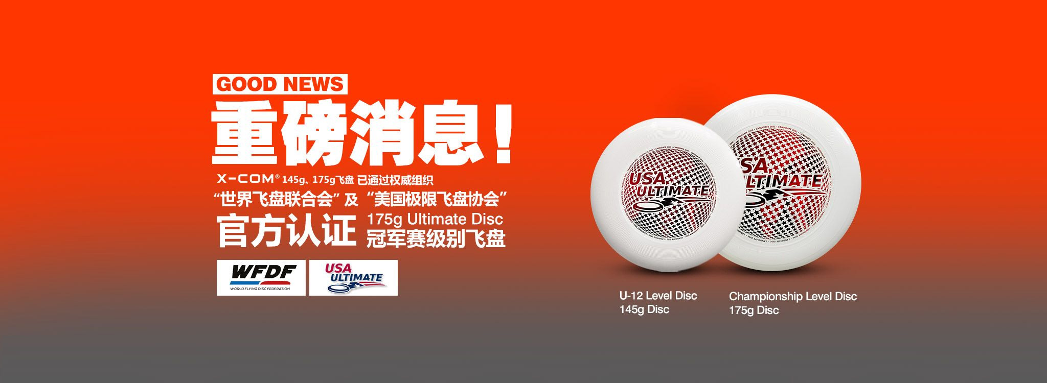X-COM极限飞盘正式成为世界飞盘联合会冠军赛用盘以及美国极限飞盘协会冠军赛级别用盘!日前在WFDF和USA Ultimate官网上均已公布X-COM极限飞盘通过了这两个组织的冠军赛极限飞盘认证,175g飞盘通过认证的全球仅4家,145g飞盘通过认证的全球仅3家。